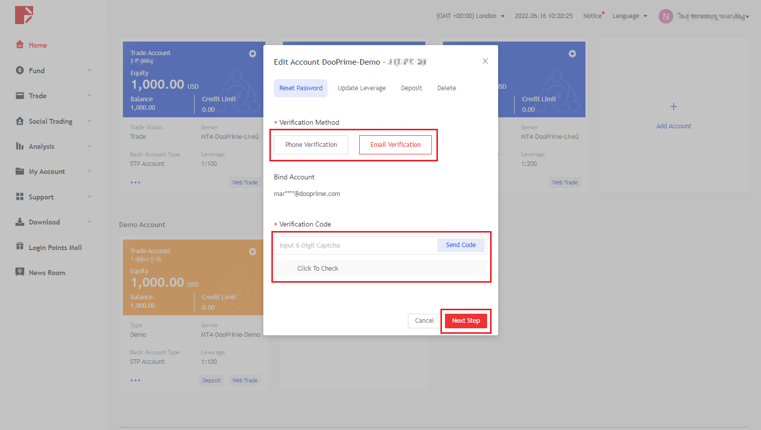 2. انقر فوق "إعادة تعيين كلمة المرور" ، واختر "التحقق من الهاتف المحمول" أو "التحقق من البريد الإلكتروني" ، وانقر فوق "تحقق" ، ثم انقر فوق "التالي" بعد استلام رمز التحقق.