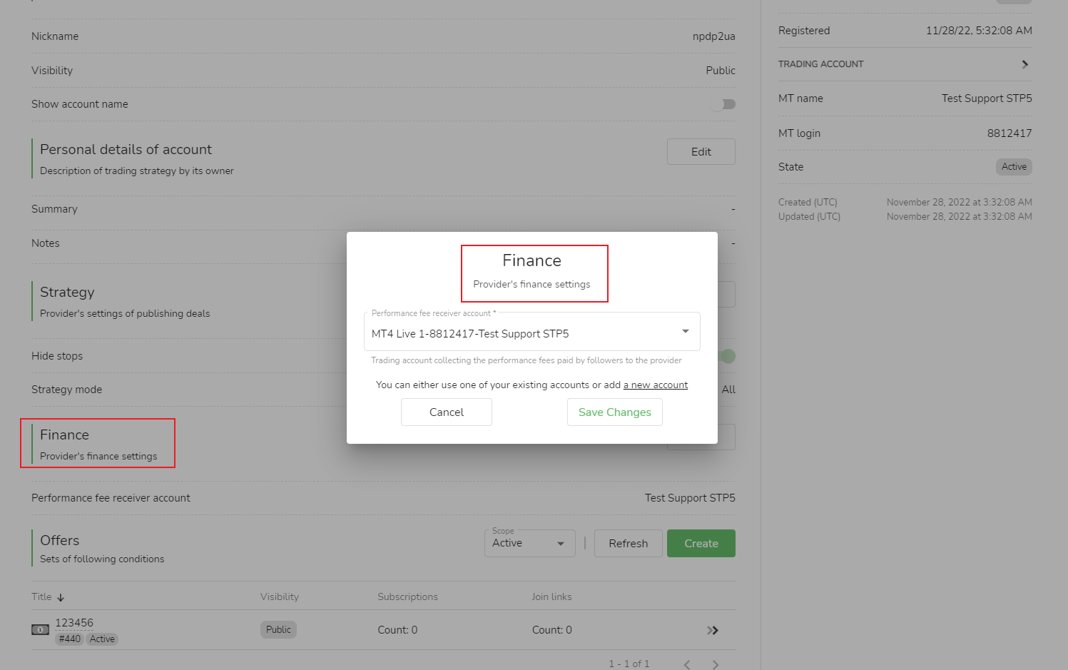 حساب قبول رسوم الأداء:حساب التداول الذي يجمعه مصدر الإشارة المتابعين لدفع رسوم الأداء لمصدر الإشارة يمكنه اختيار حساب موجود أو إضافة حساب جديد.في عملية إضافة حساب جديد ، تحتاج إلى ملء حساب التداول (أي ، حساب التداول في MetaTrader) وكلمة المرور (أي كلمة مرور معاملة MetaTrader) ثم انقر فوق [حفظ التغييرات] لإكمال الإعدادات بنجاح.