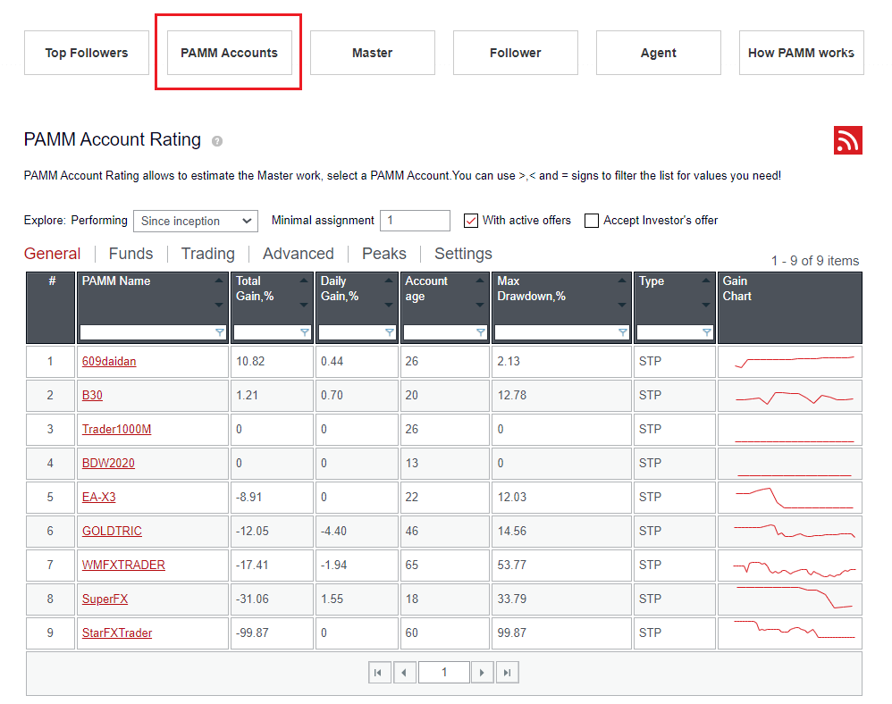 لمزيد من المعلومات ونتائج التداول حول السيد، انقر على اسم PAMM الخاص به للتحليل. يتم تقسيم المعلمات إلى خمس مجموعات: عام، التمويل، التداول، المتقدم، الذروة والإعدادات. يمكن للمستخدمين فرز عوامل التصفية وتطبيقها على أي عمود.