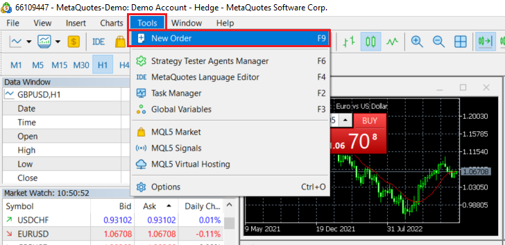 إنشاء أمر جديد يعني فتح مركز جديد أو الإضافة إلى مركز موجود.يمكن لـ MT5 إضافة مراكز جديدة في وحدات أدوات متعددة. يمكنك إنشاء طلب جديد بالطرق التالية: