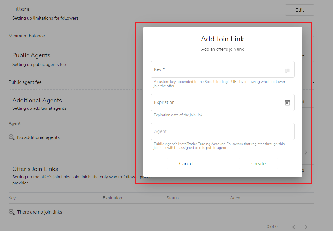 The signal source can fill in the [Identification Code] after clicking [Add], set the [Validity] of the joining link, and then fill in the MetaTrader trading account of the introducer and click [Create]. Please note: the MetaTrader trading account of [Introduction Promotion] here can be successfully filled only after the percentage of introduction promotion fee is set.
