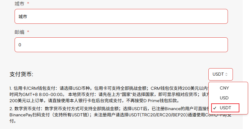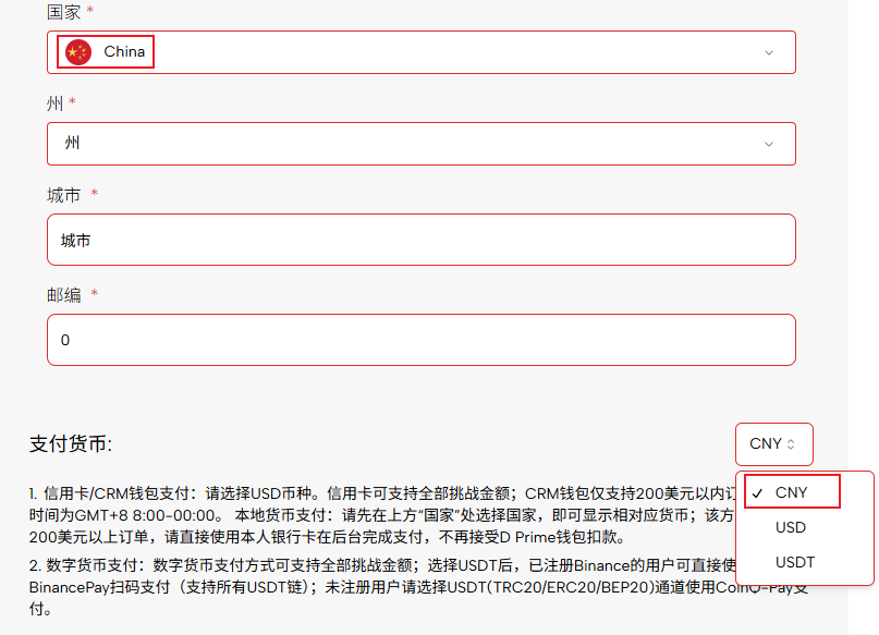 • 在付款页面 “国家” 处选择您希望支付的货币所属国家以及“州”,并在 “支付货币” 下拉菜单中选择对应币种(如:CNY)。