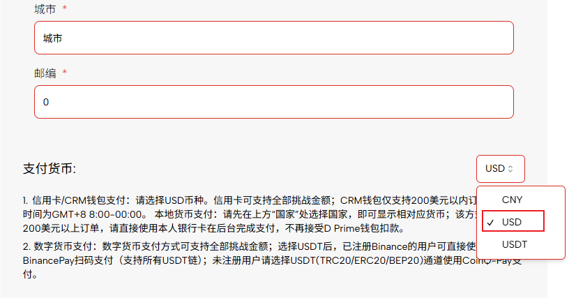 • 在付款页面 “支付货币” 下拉菜单中选择 USD,即可在跳转后的页面看到信用卡支付通道。