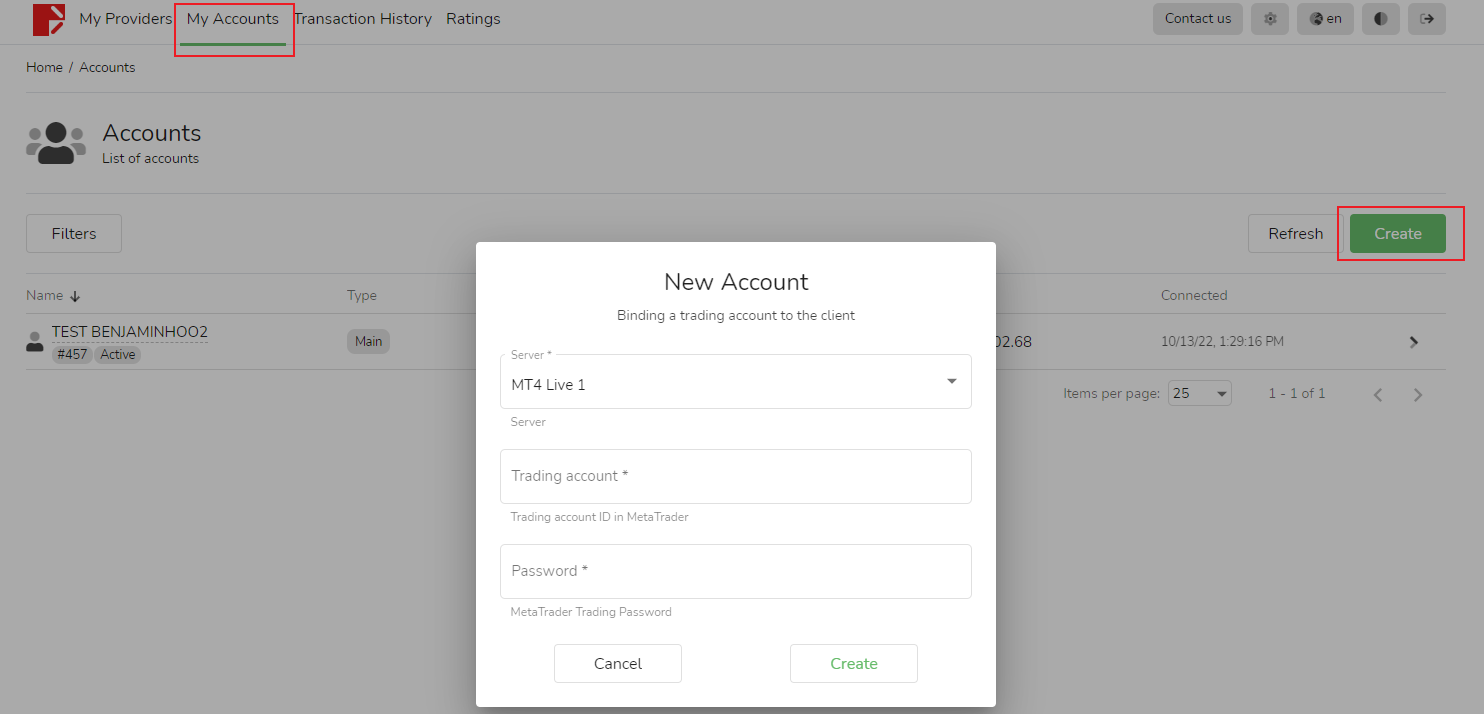 Trên trang [Tài khoản của tôi] của người theo dõi, bạn có thể thêm tài khoản giao dịch mới bằng cách nhấp vào nút [Tạo] màu lục. Tuy nhiên, tài khoản này không thể được sử dụng để đăng nhập và chỉ có thể được chọn làm nguồn tín hiệu, người theo dõi hoặc thiết lập để nhận phí hiệu suất.