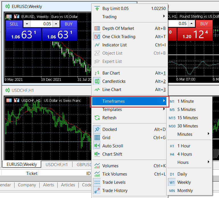 Nhấp chuột phải vào [Biểu đồ] trong thanh menu của MT5 và chọn [Thời gian] để xem tất cả các khoảng thời gian có thể được chọn trong MT5.